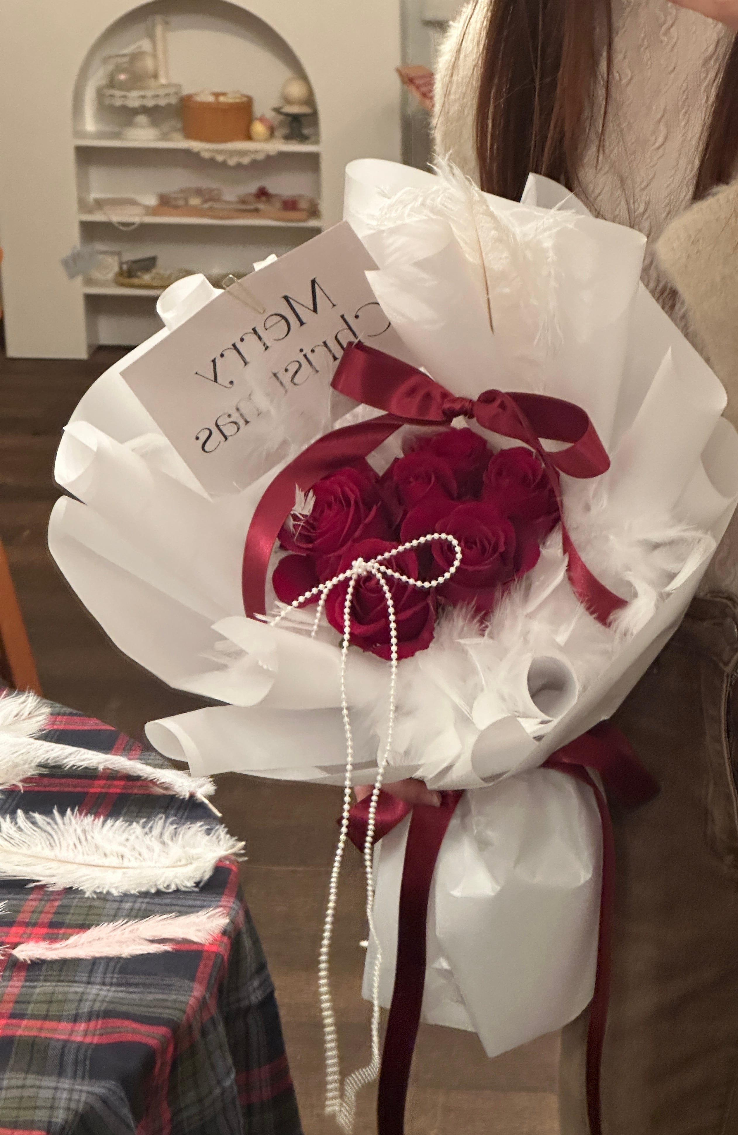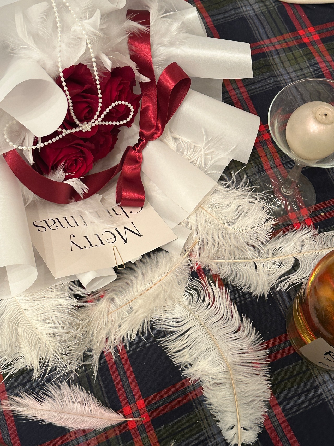 鮮やかな赤バラとフェザーの垢抜け感で令和のクリスマスを彩ます。