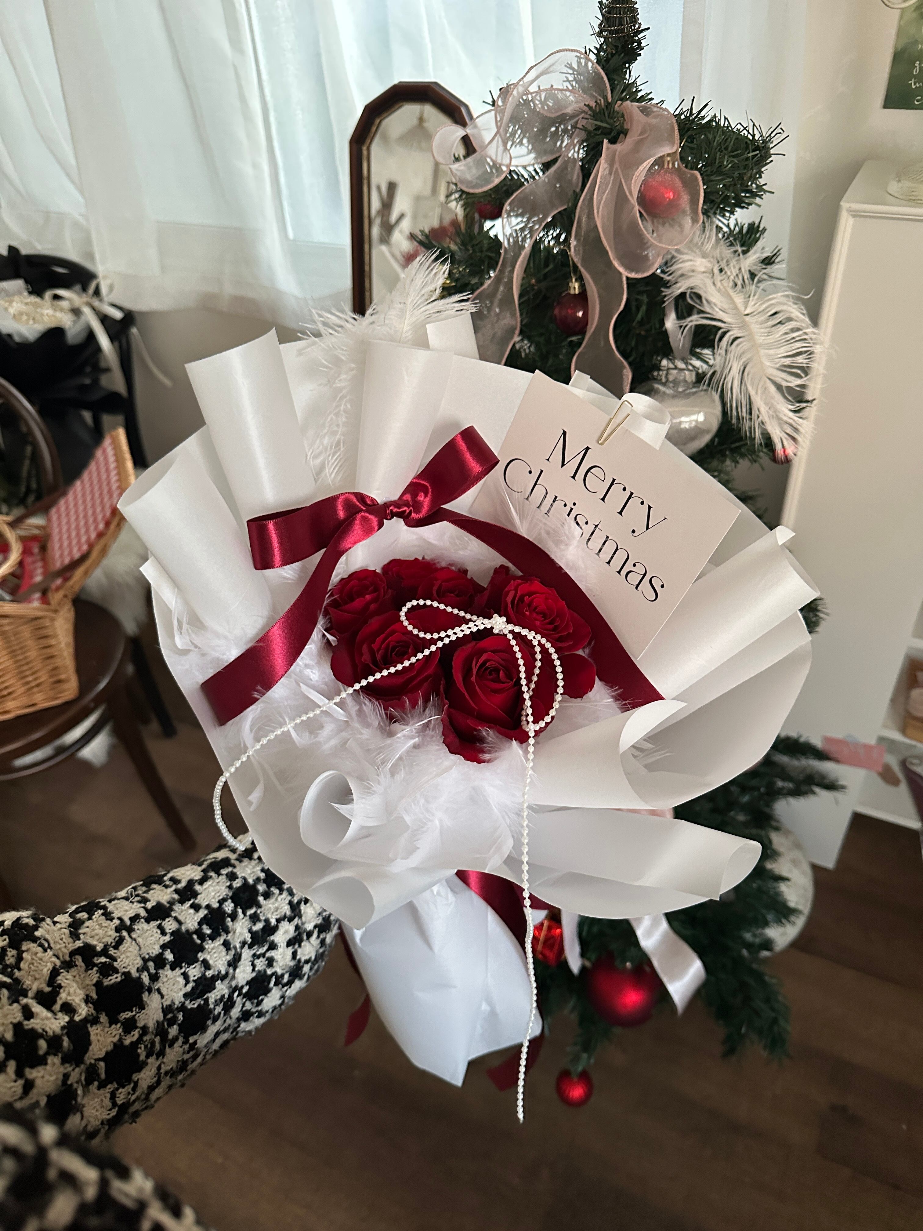 生花の赤バラ7本とフェザーを使ってラッピングしたクリスマスブーケです♪